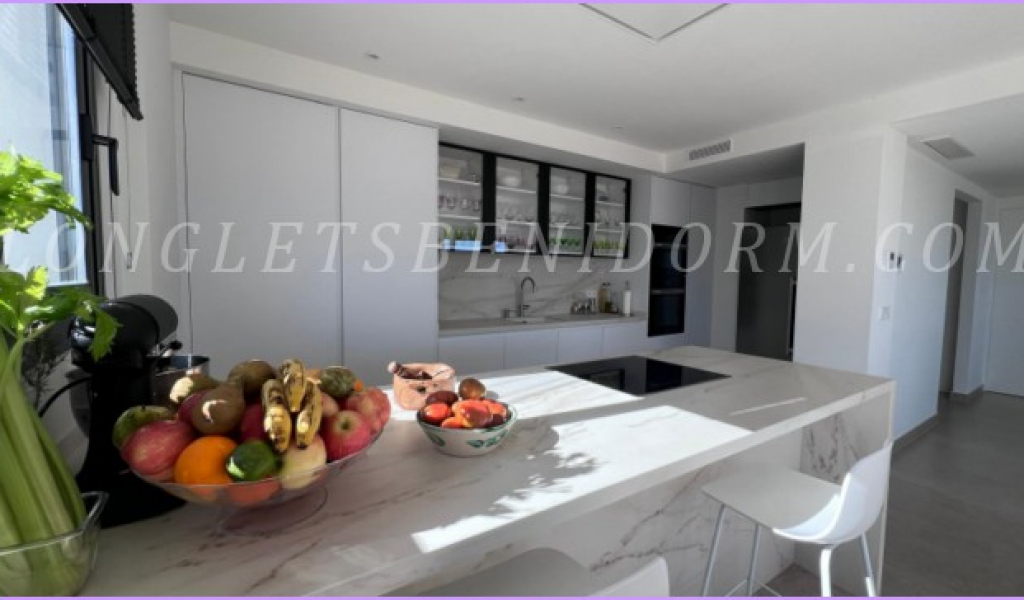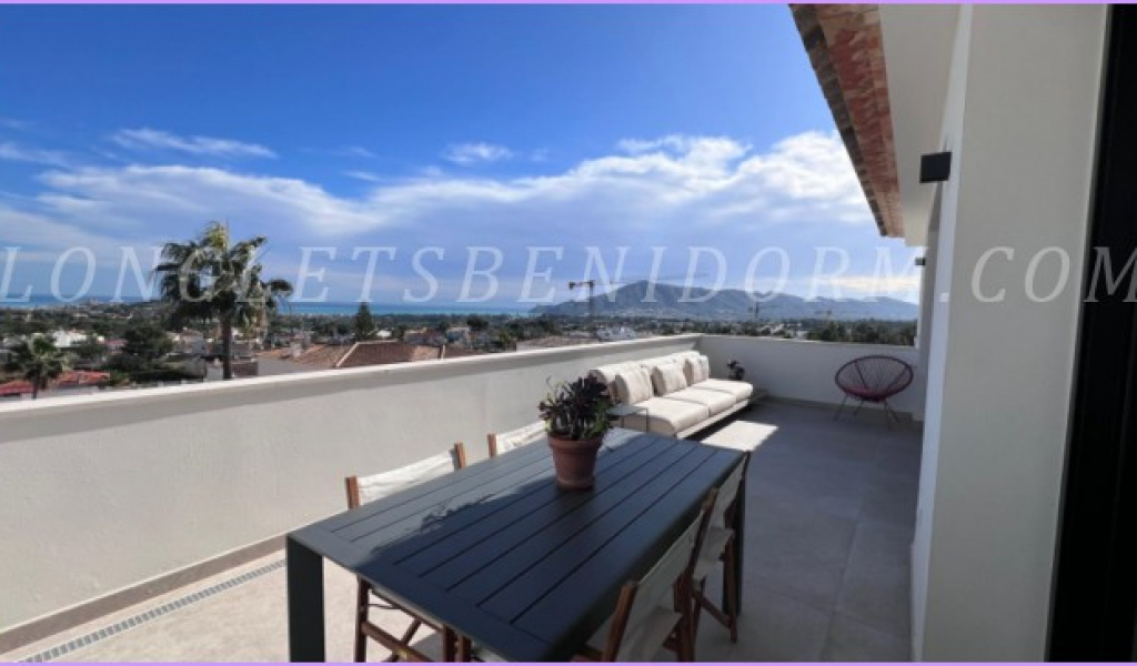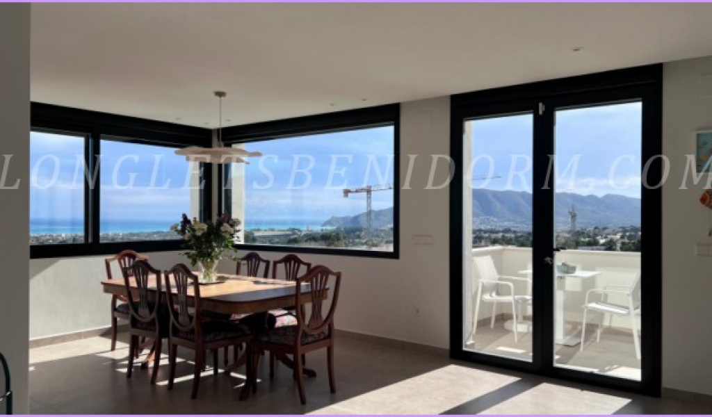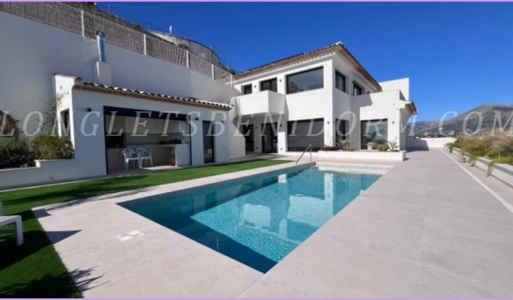 LONG LET in LA NUCÍA – ALTEA: Fantastic new luxury villa in a modern, minimalist style, featuring unique furnishings and a beautiful swimming pool with panoramic views of the mountains and sea, including the Altea skyline.