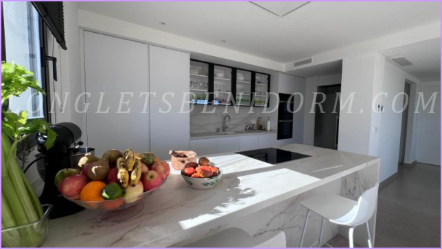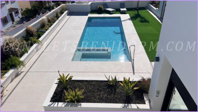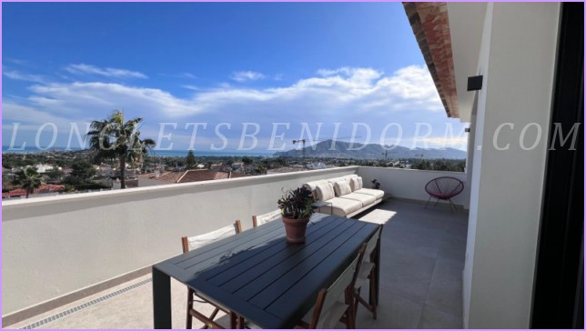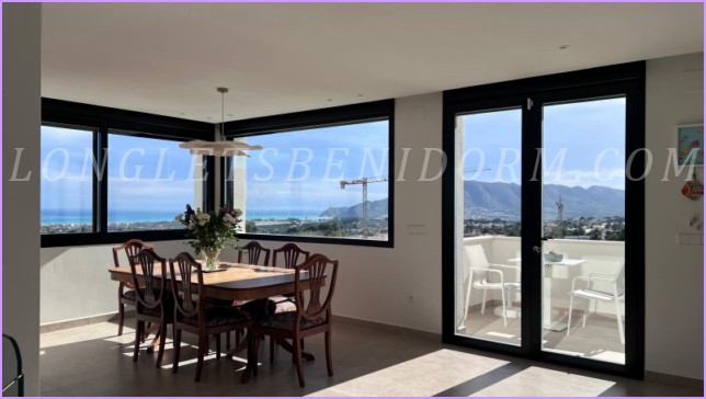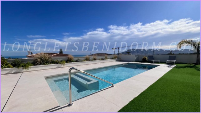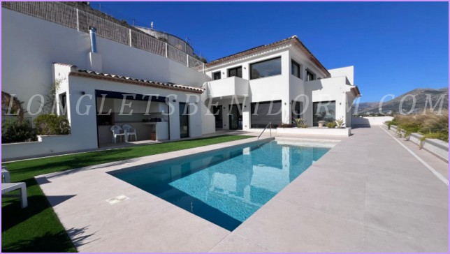 LONG LET in LA NUCÍA – ALTEA: Fantastic new luxury villa in a modern, minimalist style, featuring unique furnishings and a beautiful swimming pool with panoramic views of the mountains and sea, including the Altea skyline.