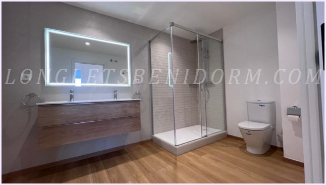 This property is on one floor (ground floor of a building with 2 villas) and has a large, open-plan, bright living room with a modern, fully equipped kitchen with an island. In the living room area there is a guest toilet and a room with a washer-dryer and water heater (can be used as a laundry room or storage area, etc.). The villa has 3 bedrooms, the master with a dressing room and a fantastic en-suite bathroom with shower. The other 2 bedrooms also have a large bathroom with shower.