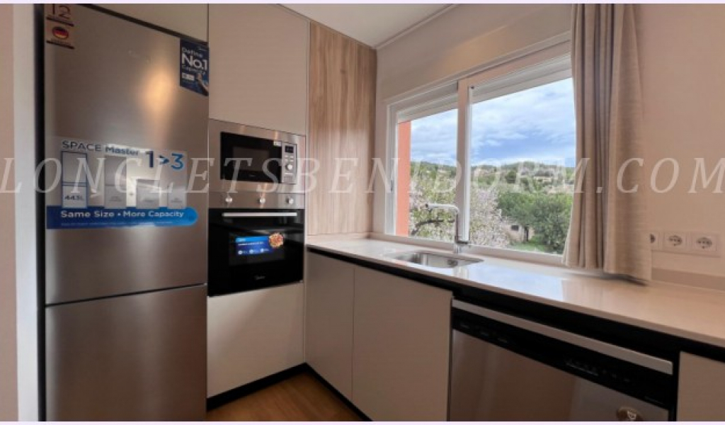 Deze woning is gelijkvloers (bovenverdieping van een gebouw met 2 villa’s) en heeft een grote, open en lichte woonkamer met een moderne, volledig uitgeruste keuken met kookeiland. In de woonkamer bevinden zich een gastentoilet en een kamer met de wasmachine-droger en de boiler (kan dienen als wasruimte of opslagruimte, enz.). De villa heeft 3 slaapkamers, waarvan de grootste met een kleedkamer en een fantastische en-suite badkamer met douche. De andere 2 slaapkamers hebben ook een grote badkamer met douche.