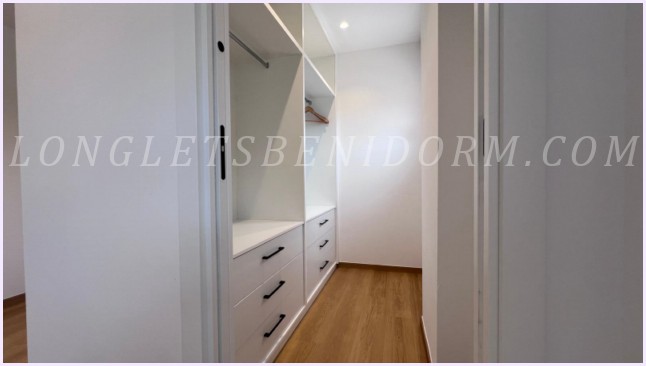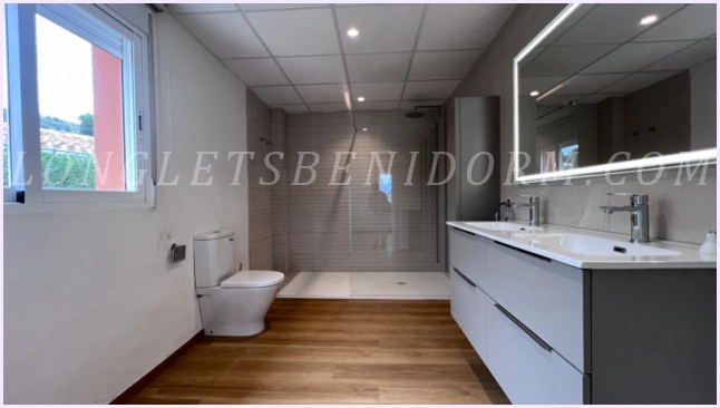 Deze woning is gelijkvloers (bovenverdieping van een gebouw met 2 villa’s) en heeft een grote, open en lichte woonkamer met een moderne, volledig uitgeruste keuken met kookeiland. In de woonkamer bevinden zich een gastentoilet en een kamer met de wasmachine-droger en de boiler (kan dienen als wasruimte of opslagruimte, enz.). De villa heeft 3 slaapkamers, waarvan de grootste met een kleedkamer en een fantastische en-suite badkamer met douche. De andere 2 slaapkamers hebben ook een grote badkamer met douche.